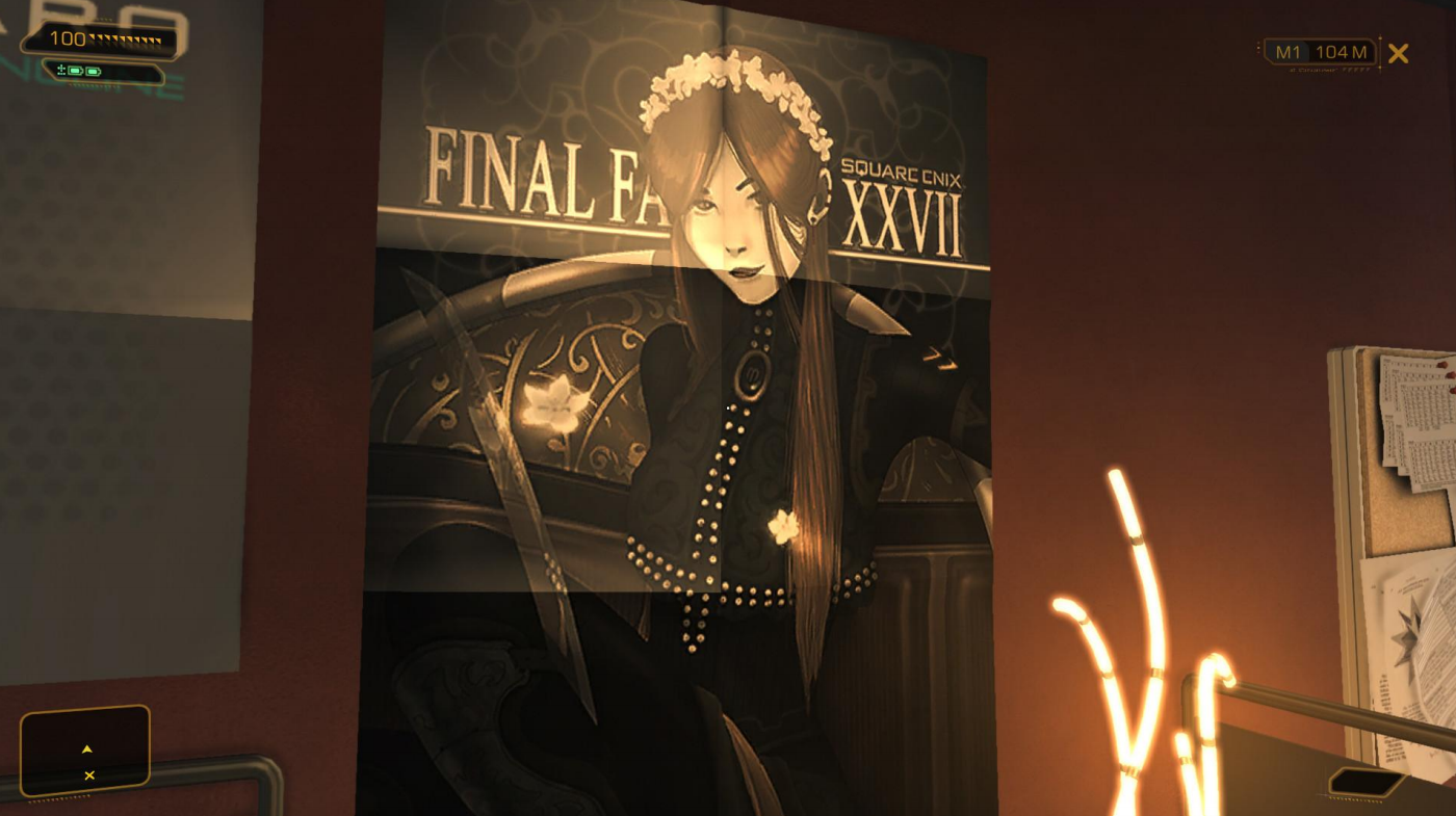 It’s this one; this poster in an office at the start of the game. It’s for a Final Fantasy doesn’t exist yet and, sure that’s funny, because Human Revolution was made by Square Enix and the game is set in the future and…